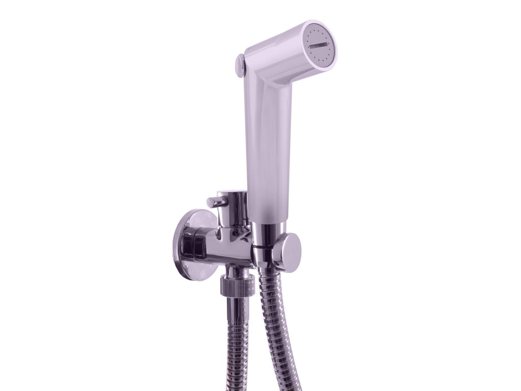 Hygienický komplet k bidetové baterii na dvě použití (na jednu vodu nebo na dvě vody s použitím vestavěné baterie), s průtočným držákem s keramickým ventilem, sprcha s tlačítkovým mechanismem - plast.