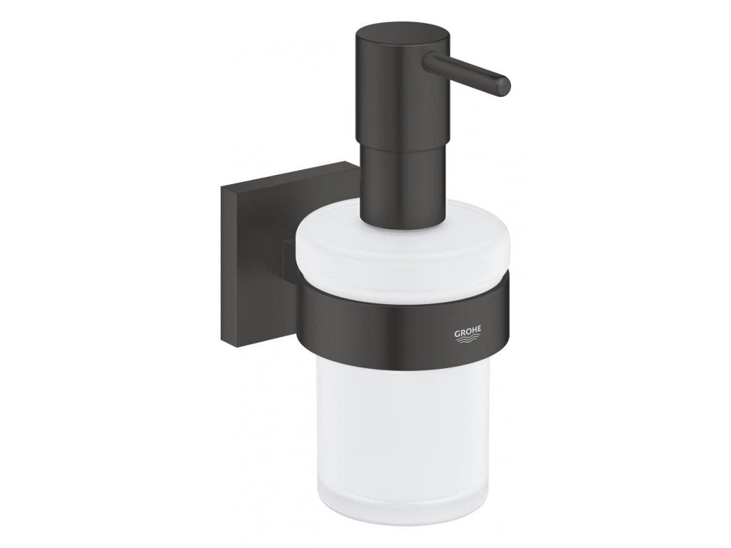 Dávkovač mýdla v barevném provedení černá mat. Šířka tohoto koupelnového doplňku od značky GROHE je 7,2 cm a je vyroben z materiálu kov, sklo. Montáž lepením i vrtáním.