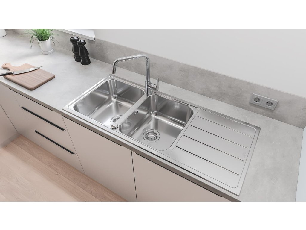 Nerezový dvoudřez s odkapávačem s montáží na pracovní desku o rozměru 116x50 cm a hloubkou 19 cm. Vhodný pro montáž do skříňky o šířce 80 cm.