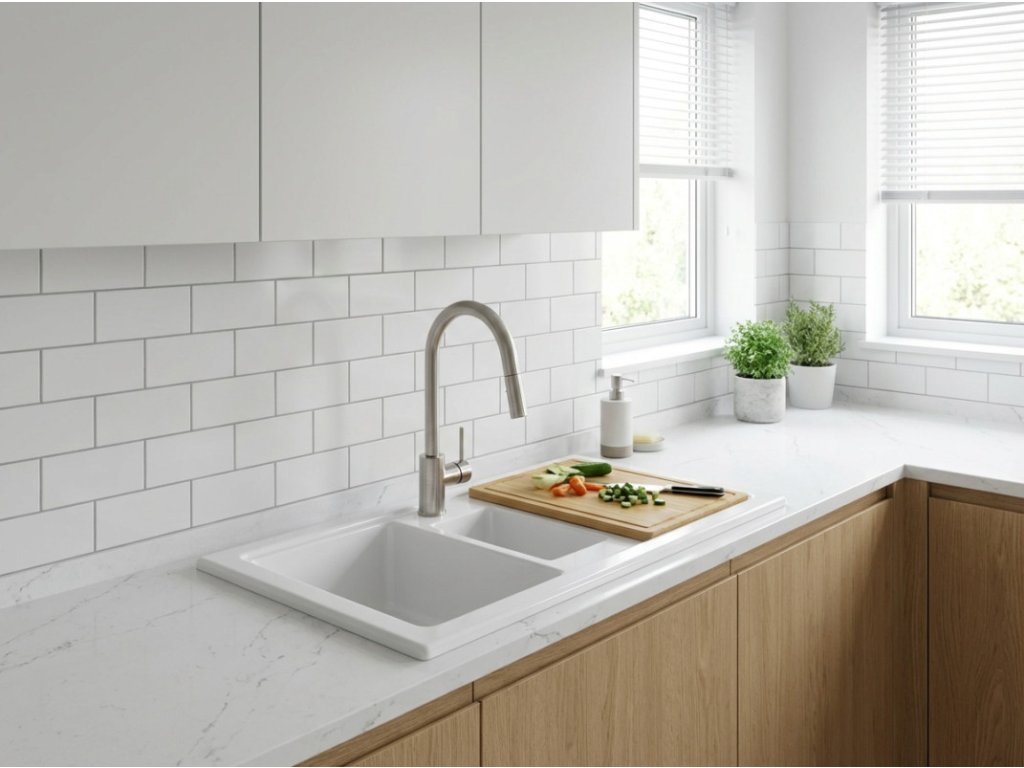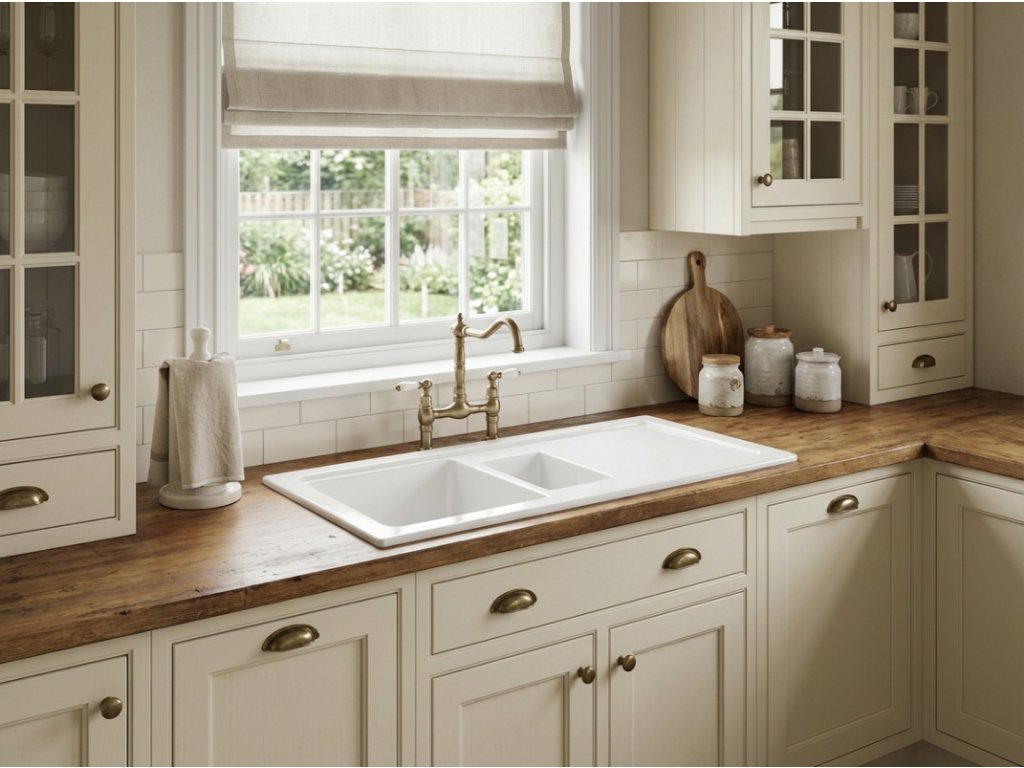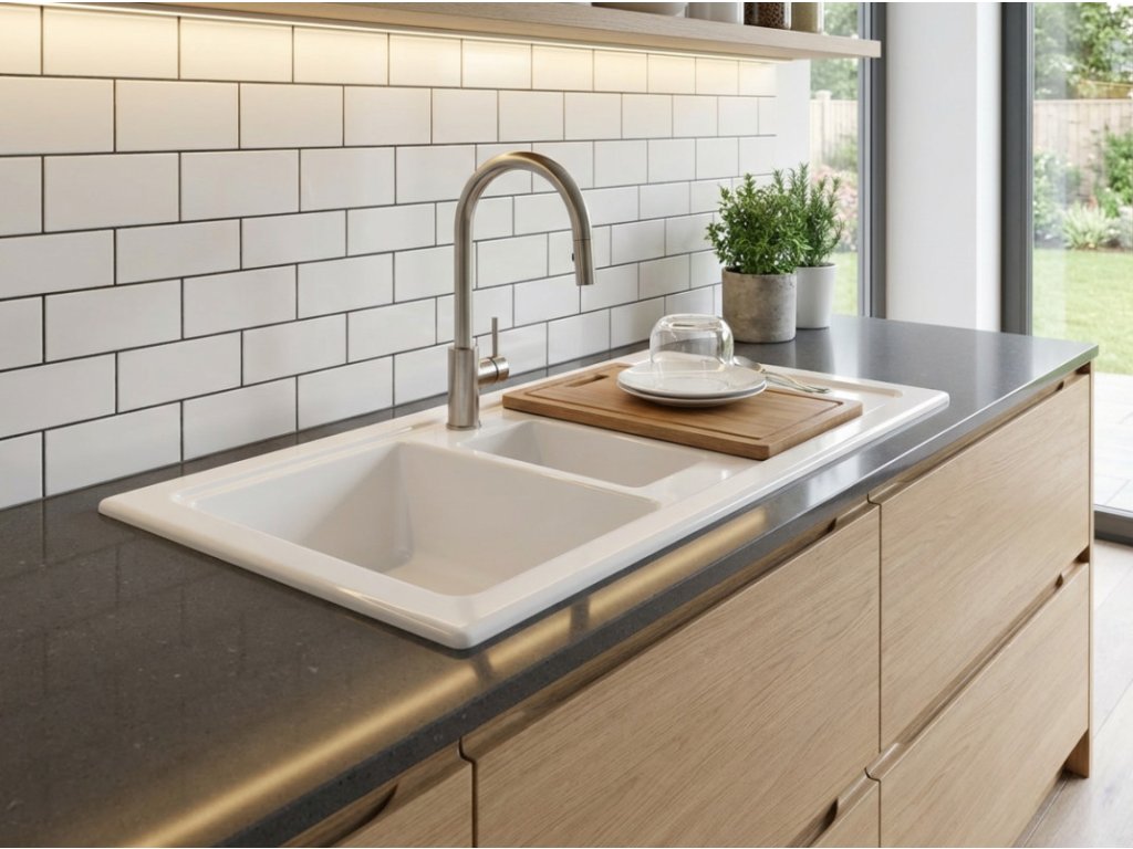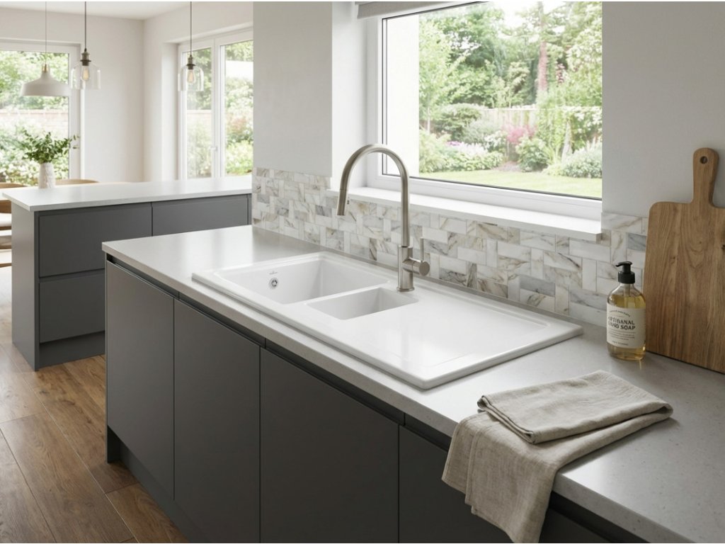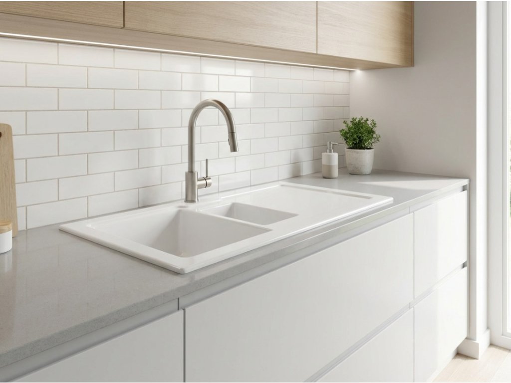 - zářivě bílý keramický dřez ve vysokém lesku s odkapávačem a vaničkou