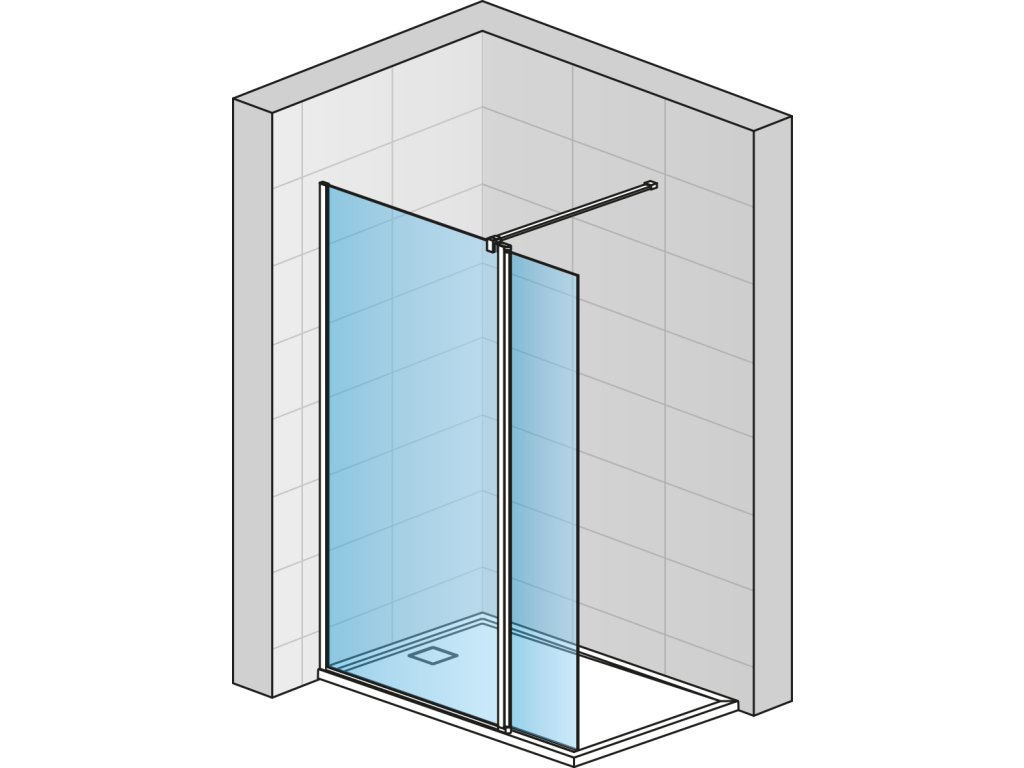 Montážní set s krátkou otočnou stěnou ve 180° v matné černé barvě ze 6mm bezpečnostního skla. Kotvicí a spojovací profil + krátká otočná stěna o šířce 406 mm. Délka vodorovné/stropní vzpěry 1500 mm. Maximální výška stropu pro kotvení je 3000 mm. Čiré sklo. Krátká otočná stěna částečně zamezí stříkání vody ze sprchovacího prostoru.