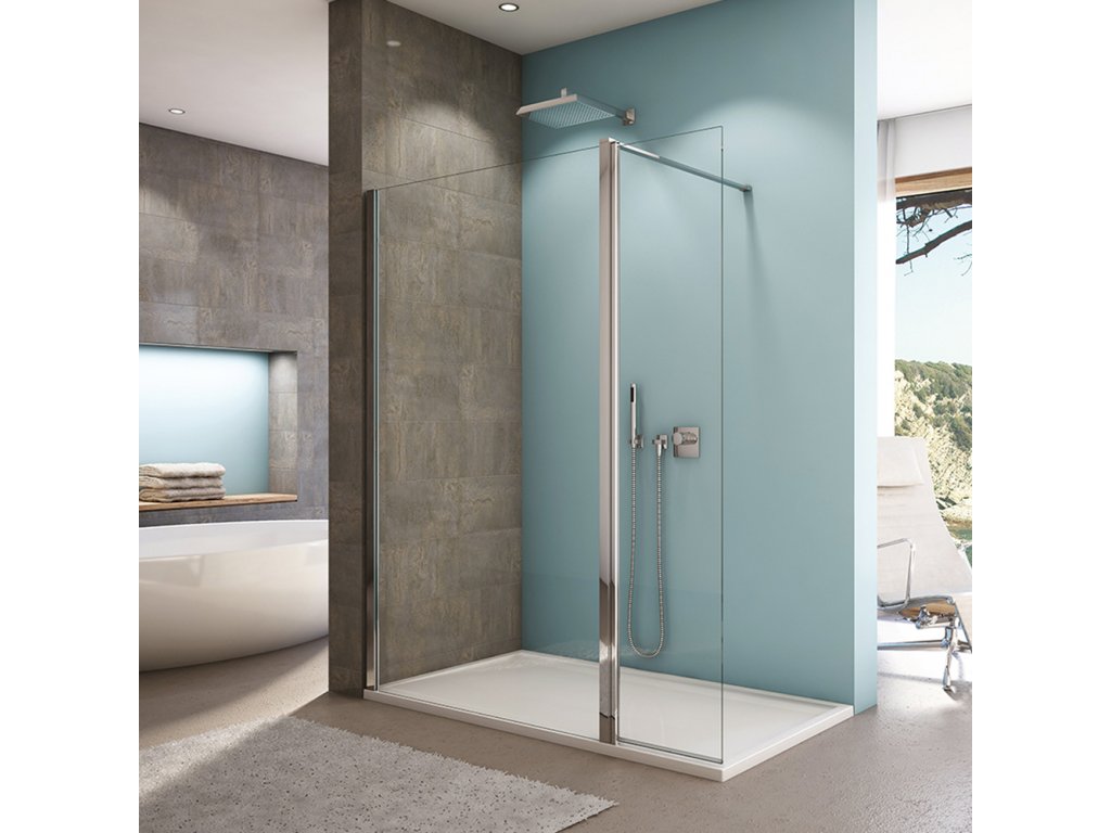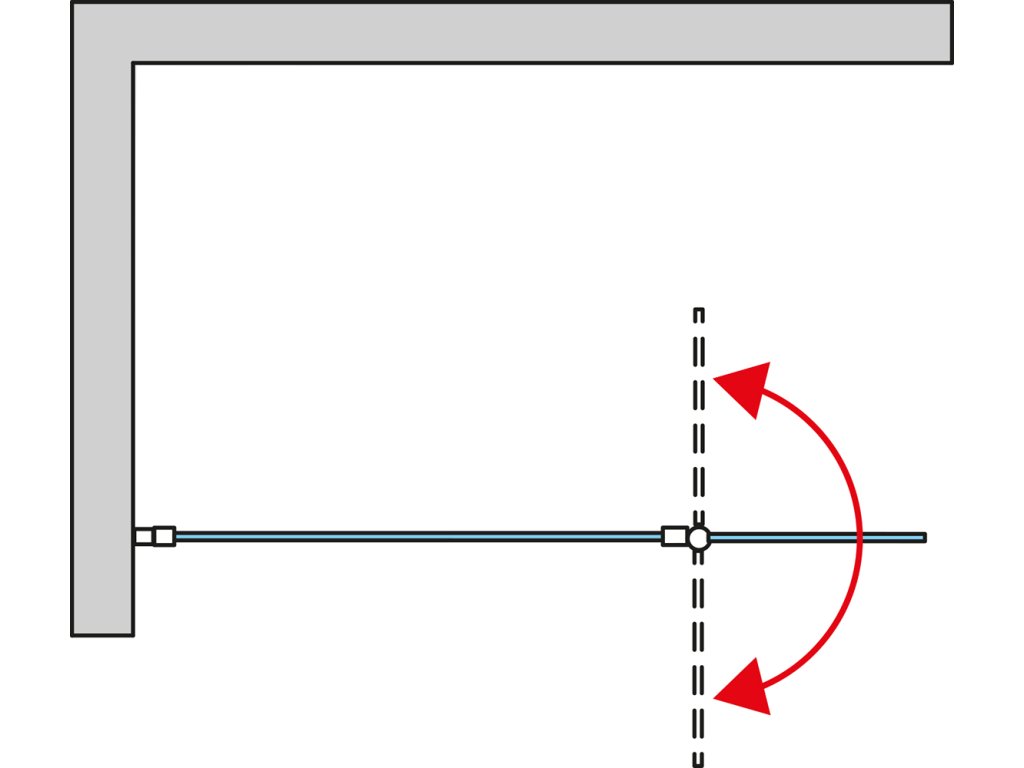 Montážní set s krátkou otočnou stěnou od RONAL. Stropní nebo stabilizační vzpěra, kotvicí a spojovací profil + krátká otočná stěna 400 mm. 6mm bezpečnostní sklo s antiplakovou úpravou Aquaperle. Délka vzpěry 1500 mm. Maximální výška stropu pro kotvení je 2600 mm. Určeno pro samostatnou pevnou stěnu TOPF2.