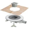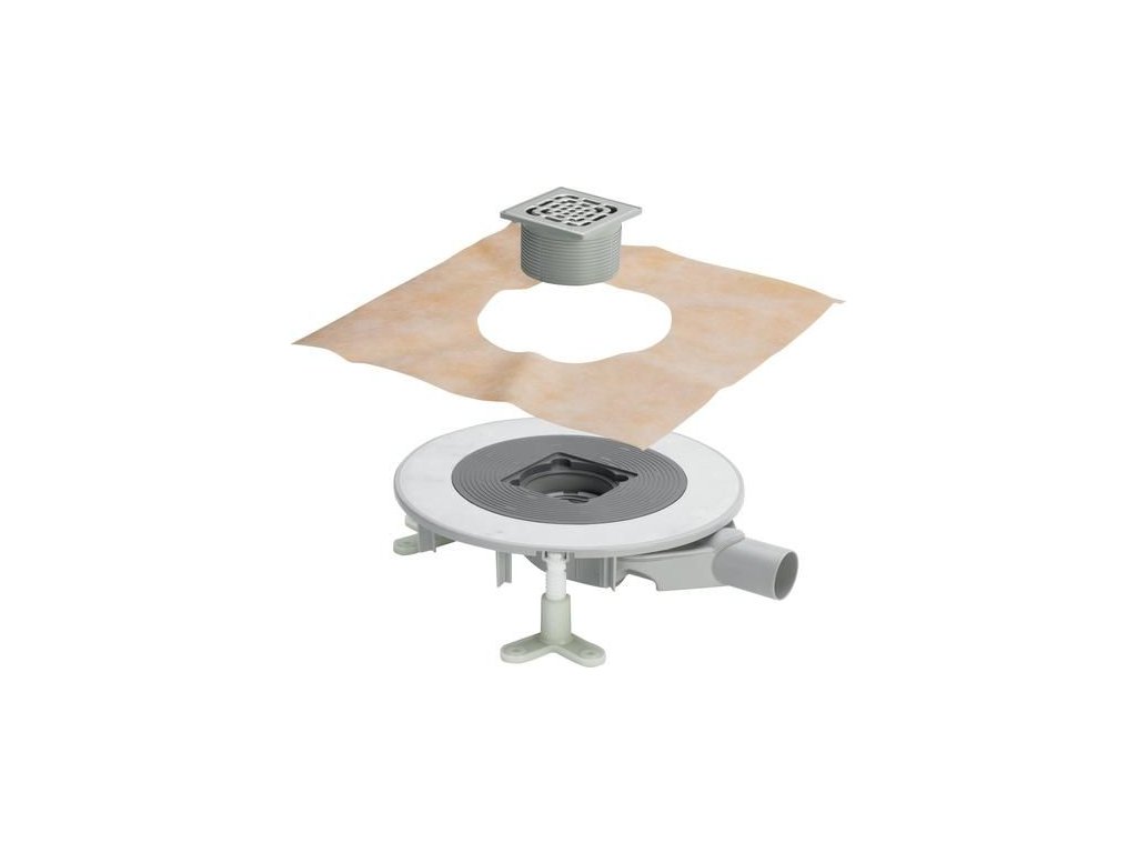 s utěsňovací přírubou pro použití s tekutými izolacemi nebo izolačními pásy (např. KERDI), se zvukotěsnou výstuží, se stavební ochranou, s nastavitelnou výškou hladiny vodní uzávěry 30 až 50 mm zabezpečené proti zpětnému odsátí a umožňující čištění přípojného potrubí, s otočným a výškově nastavitelným nástavcem 100 x 100 mm, s roštem z nerezi 1.4301, třída zatížitelnosti K = 300 kg, stavební výška 85 až 120 mm, s vyjímatelným zápachovým uzávěrem, odtokový výkon podle DIN EN 1253, 0,8 až 1 l/s, s utěsňovací manžetou Schlüter-KERDI pro utěsnění v místech spojů (např. v obložených sprchách), s vodorovným odtokovým hrdlem DN 50,
