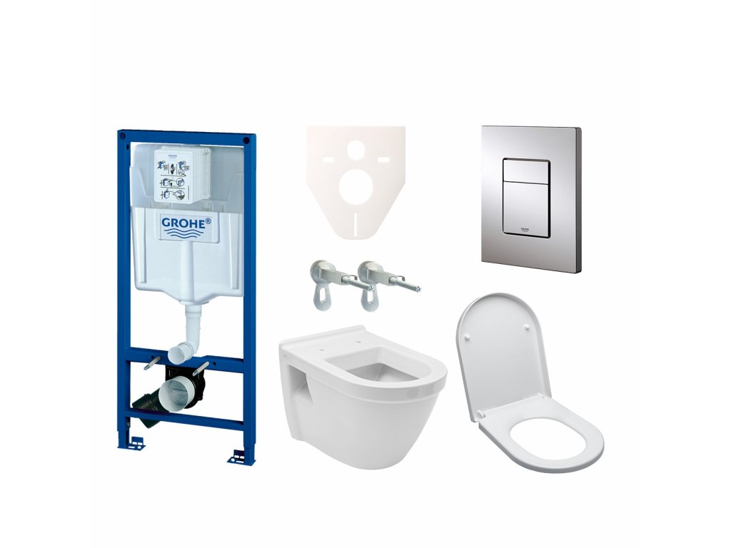 Závěsný wc set - sada obsahuje modul do lehkých stěn / předstěnová, WC nádržku GROHE a WC sedátko. WC prkénko je vyrobeno z materiálu Duroplast. Ovládací tlačítko je z materiálu plast a je v barevném provedení chrom lesklý.
