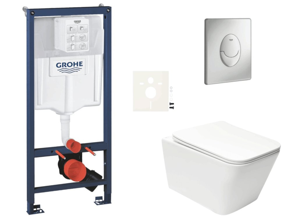 Závěsný wc set - sada obsahuje: modul do lehkých stěn / předstěnová montáž, WC nádržku GROHE, ovládací tlačítko Skate Air a WC sedátko.