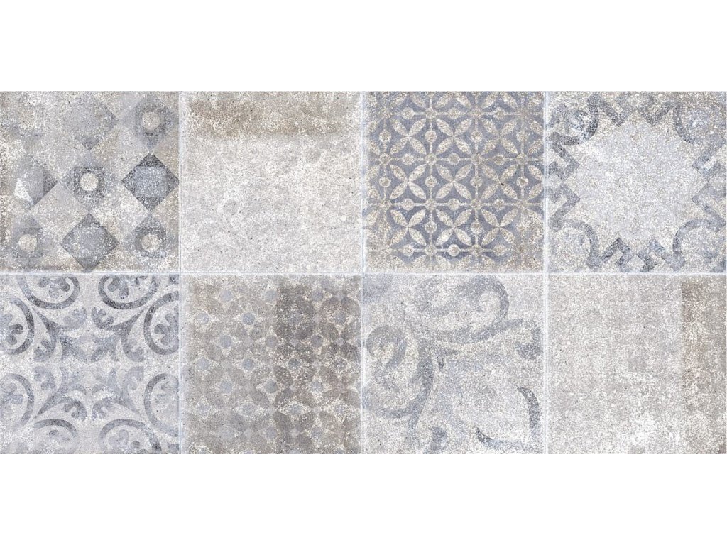 Rektifikovaný dekor v šedé barvě v patchwork designu o rozměru 29,8x59,8 cm a tloušťce 10 mm s matným povrchem. Vhodné pouze do interiéru. S velkými a nahodilými odchylkami v odstínu barev, struktury povrchu a kresby. Pouze do vyprodání zásob, převod na novou tloušťku 8 mm. K objednání pod kódem WARVK263.1