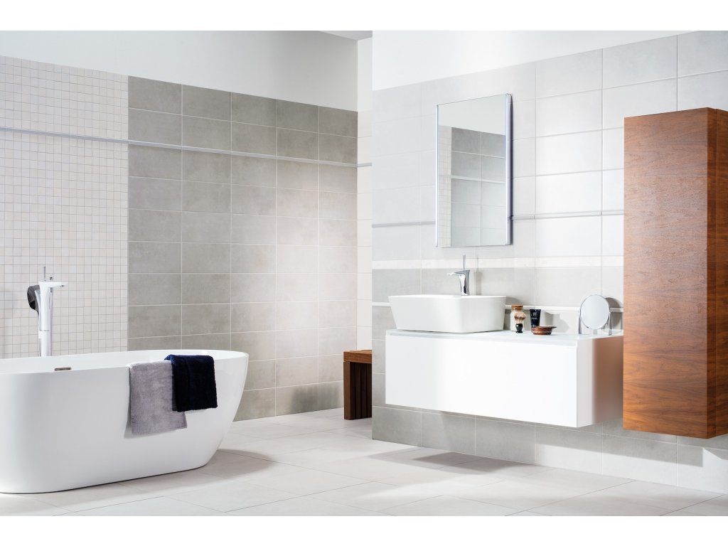 Obklad v bílé barvě v betonovém designu o rozměru 29,8x59,8 cm a tloušťce 10 mm s matným povrchem. Vhodné pouze do interiéru. S malými rozdíly v odstínu barev, struktury povrchu a kresby.