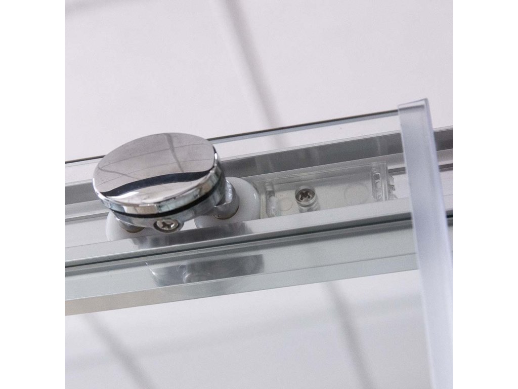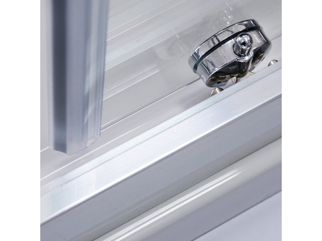 Dveře můžete odklopit velmi jednoduše. Jak můžete vidět na obrázku, na pojezdech se nachází stříbrný "čudlík". Čudlík stlačte směrem dolů a následně dveře už jen odklopíte od lišty. Je nutné oba dva čudlíky na obou pojezdech stlačit najednou, abyste sklo mohli bez problému odklopit. Dveře se však dají vyklopit pouze v dolní části, v horní části zůstávají stále připevněné, což zajišťuje, že na vás dveře nespadnou a nezpůsobí žádný úraz. Po vyčištění pojezdy jen nacvaknete zpět do lišty.