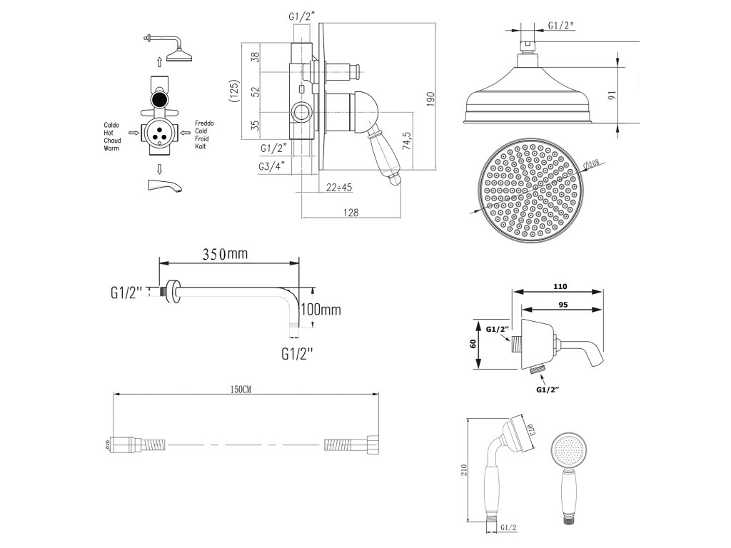 KIRKÉ WHITE podomítkový sprchový set s pákovou baterií, 2 výstupy, bílá páčka, chrom