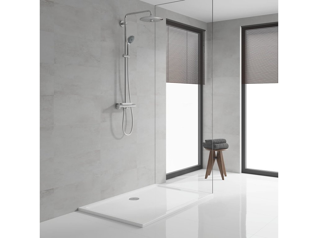 Sprchový systém včetně nástěnné baterie. S termostatickou baterií. S montáží na stěnu. Se 2 funkcemi. Rozteč baterie je 150 mm. Průtok 9,5 litrů/minutu.