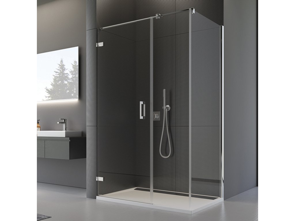 Boční stěna s vyrovnávacím profilem od společnosti RONAL, 8mm bezpečnostní sklo s antiplakovou úpravou Aquaperle pro snadné čištění. Součástí je stabilizační vzpěra 1250 mm a profily pro spojení pevné stěny s boční stěnou v 90°.