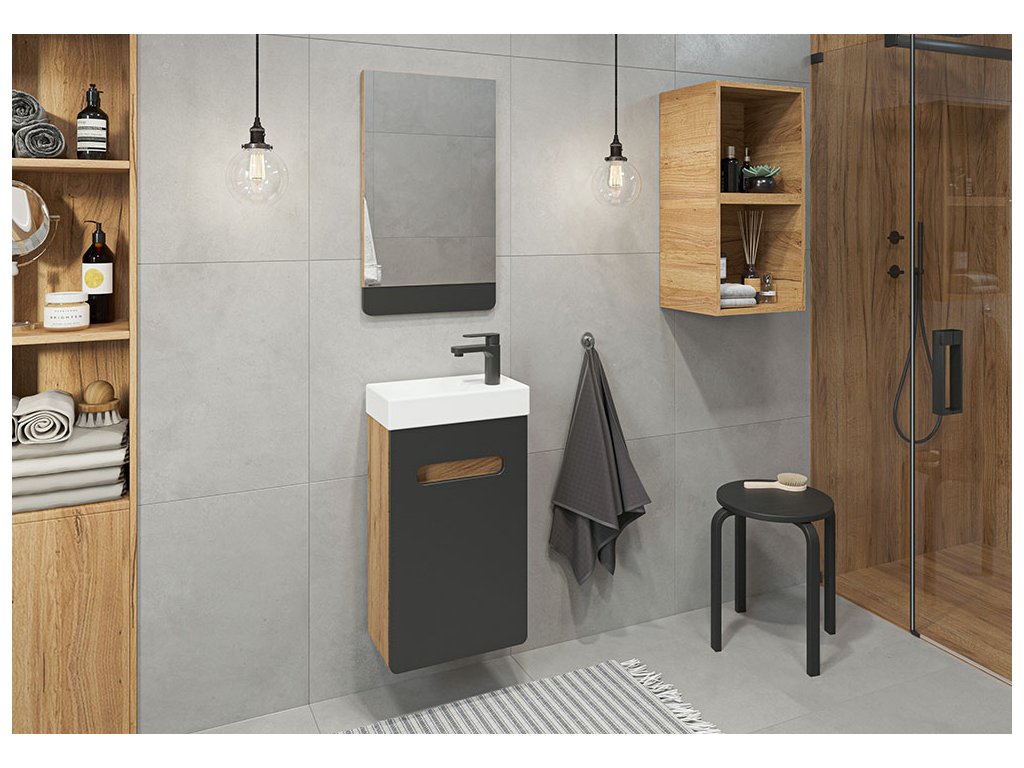 | Popis: | • koupelnová skříňka s keramickým umyvadlem • moderní kombinace černých lakovaných čelních ploch a korpusu a doplňků v dekoru zlatý dub • 1 x dvířka s tichým dovíráním Soft-Close s frézovanými madly a možností změny směru otevírání • uvnitř skříňky je umístěna 1 výškově nastavitelná police z LTD bílé barvy • součástí skříňky je keramické umyvadlo Lutecia 40 UM s přepadem a otvorem pro montáž vodovodní baterie v univerzálním pravo/levém provedení (s baterií na pravé, nebo levé straně) • k zavěšení na stěnu je skříňka vybavena rektifikačními závěsy |