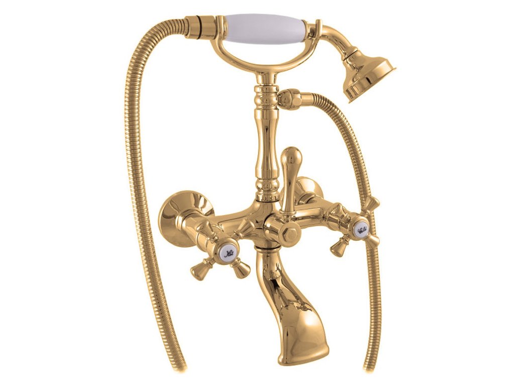 Vodovodní baterie vanová nástěnná s vidlicí na odkládání sprchy a se sprchou.