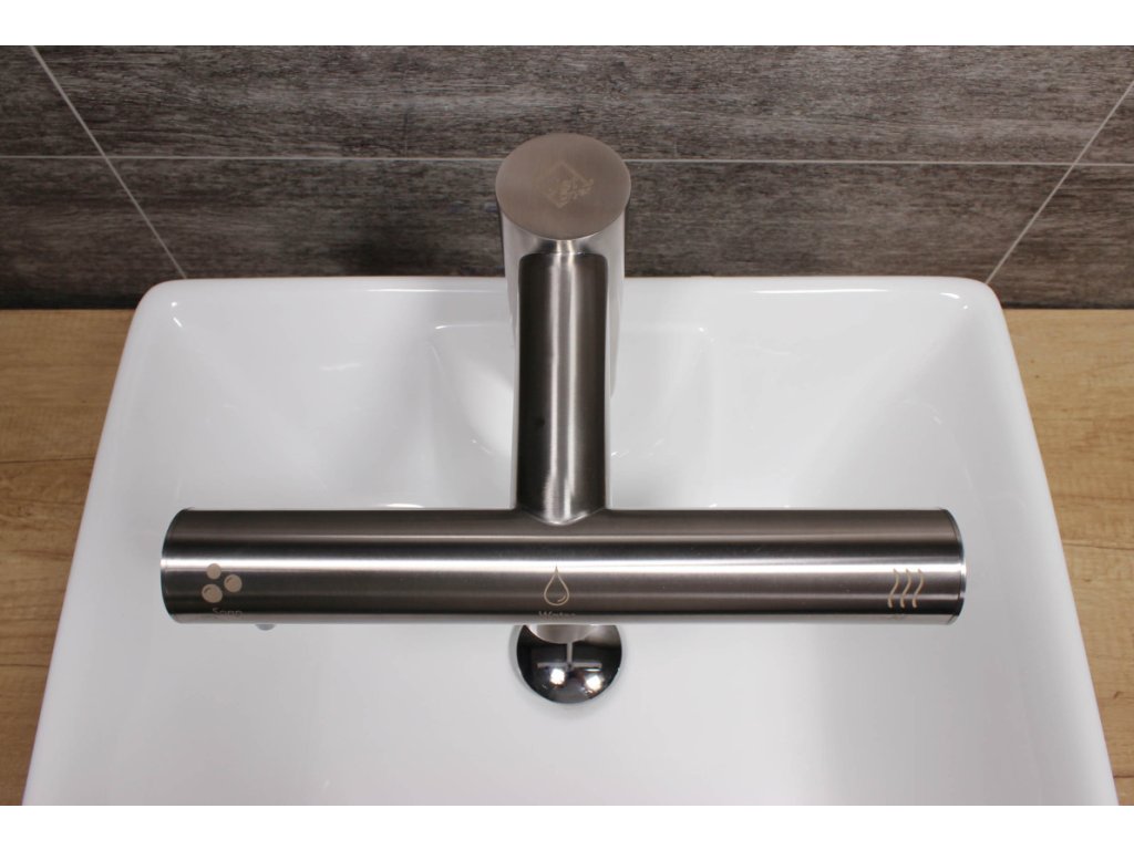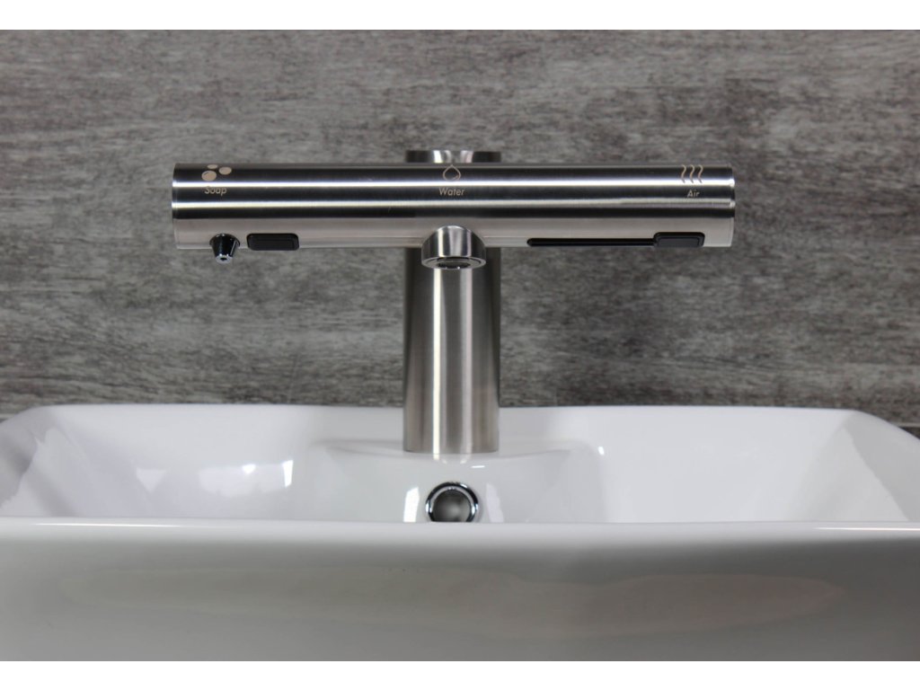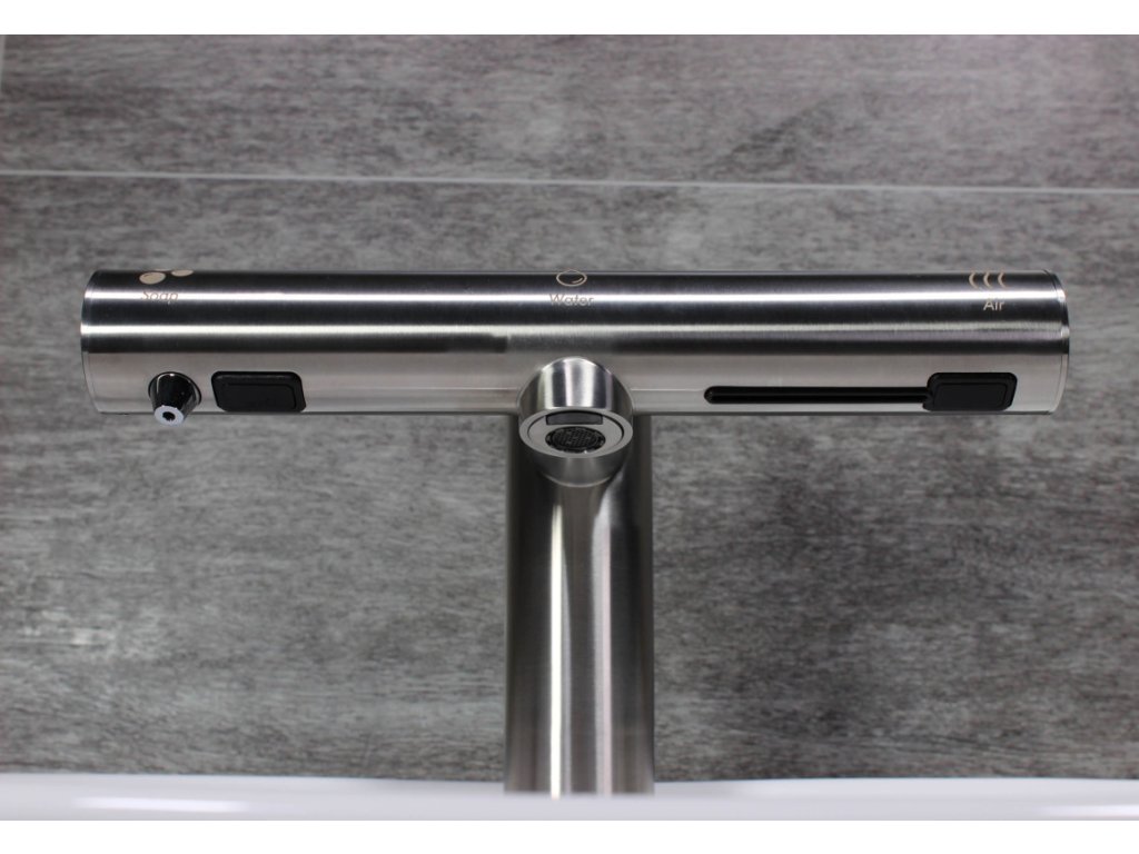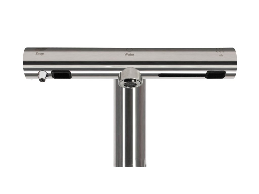 Jet Dryer AIRTAP 3v1 je revoluční zařízení, které kombinuje dávkovač mýdla, vodovodní baterii a vysoušeč rukou do jednoho kompaktního těla. Uživatel tak zvládne celý proces hygieny – od mýdla až po osušení rukou – bez přesunů, bez kontaktu a přímo u jednoho umyvadla.