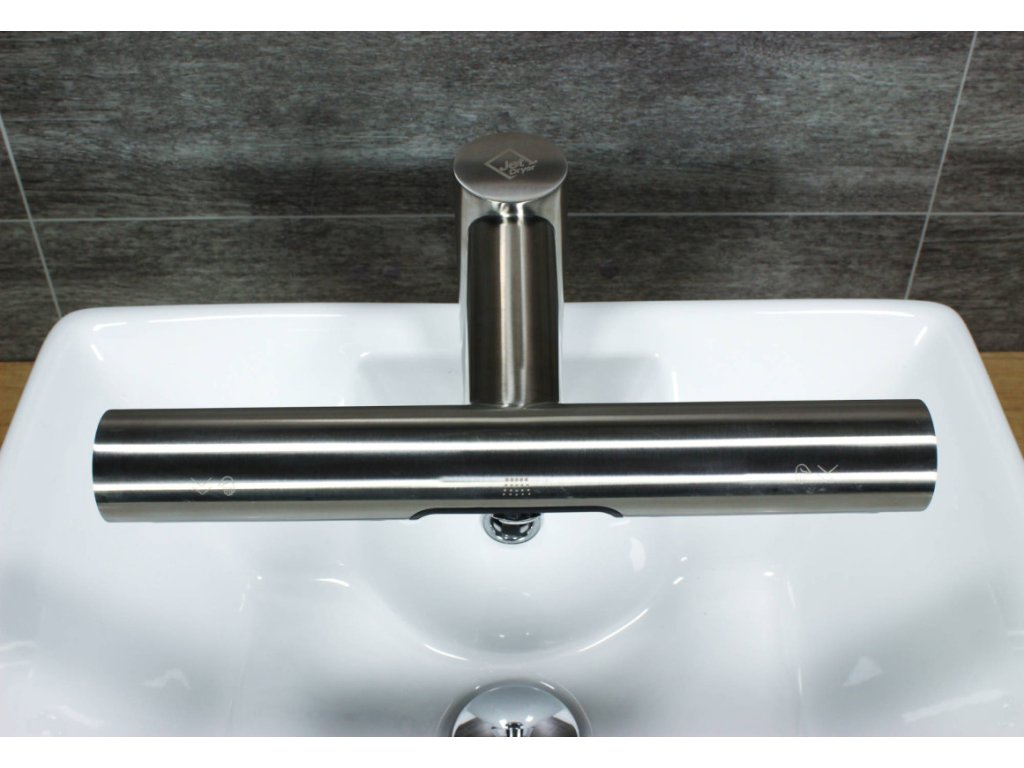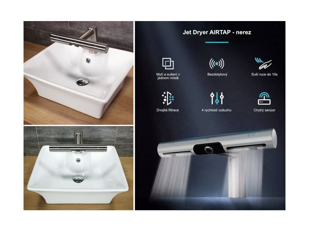Inovativní design vysoušeče Jet Dryer AIRTAP - kulatá kombinuje tryskový vysoušeč s automatickou vodovodní baterií. Ruce si tak můžete pohodlně umýt i vysušit na jednom místě – přímo v umyvadle. Jet Dryer AIRTAP - kulatá je vybaven HEPA filtrem. Vodovodní baterie i vysoušeč je bezkontaktní pro maximálně hygienický provoz. Díky tomu, že má každé umyvadlo svůj vysoušeč, provoz na toaletách je plynulý a bez front.