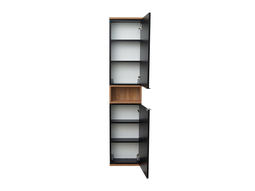 Doplňková skříňka vysoká Nelis B V 35 P/L je určena k zavěšení na zeď pomocí rektifikačních závěsů. Jedná se o sestavu dvou uzavřených antracitových skříněk s dvířky s tichým dovíráním SoftClose a možností změny směru otevítání (vpravo/vlevo) doplněných střední otevřenou policí v dekoru dub country. Celá skříňka je pak doplněna horní a spodní deskou rovněž v dekoru dub country. Horní i spodní skříňku je nutné zavěst na zeď samostatně pomocí rektifikačních závěsů. V horní a spodní uzavřené části skříňky jsou umístěny vždy 2 police z LTD.